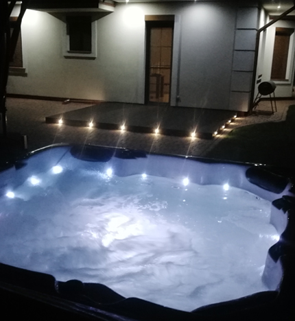 całoroczne jacuzzi z oświetleniem LED, szerokim wodospadem, systemem audio z głośnikami ozonatorem do oczyszczania wody oraz 49 dysz masujących